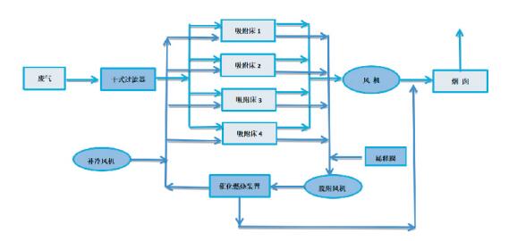 Adsorpsjonstankens spesifikasjoner og adsorbentmengden er utformet i henhold til luftvolumet for å sikre en viss gasshastighet og oppholdstid, slik at adsorbenten effektivt og fullt ut kan absorbere det organiske løsningsmidlet i restgassen. Adsorpsjonstanken fungerer vekselvis, og arbeidstilstanden til adsorpsjonstanken byttes automatisk av PLS automatiske kontrollsystem for vekselvis å utføre de tre prosessene med adsorpsjon, desorpsjon, kjøling og tørking, og så videre.