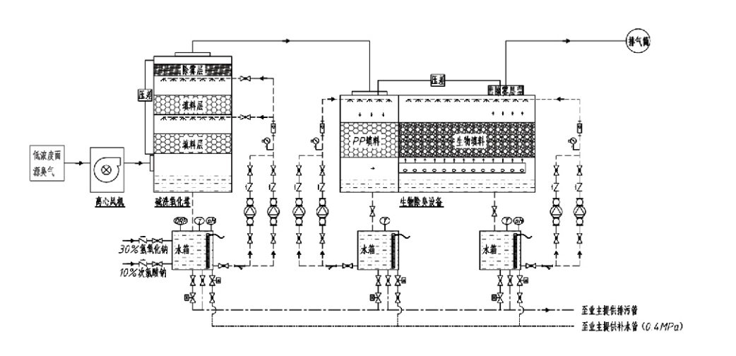 Den kombinerte biologiske skrubbings- og filtreringsdeodoriseringsenheten integrerer tre biologiske teknologier: biologisk skrubbing, biologisk sildrefiltrering og biologisk filtrering. Denne nye sammensatte biologiske deodoriseringsanordningen ble utviklet ved å syntetisere fordelene med disse tre biologiske teknikkene. Luktende gasser kommer inn i skrubbesonen via innløpet, hvor de gjennomgår forbehandling med vann eller konsentrerte kjemiske skrubbeløsninger. Denne skrubbesonen fullfører absorpsjonen av vannløselige kjemikalier, fjerning av støv og fukting av de luktende gassene. Ikke-fjernede illeluktende gasser fortsetter deretter til filtreringssonen for flertrinns biofilterbed. Når de passerer gjennom filterlaget, overføres forurensninger fra gassfasen til overflaten av biofilmen: